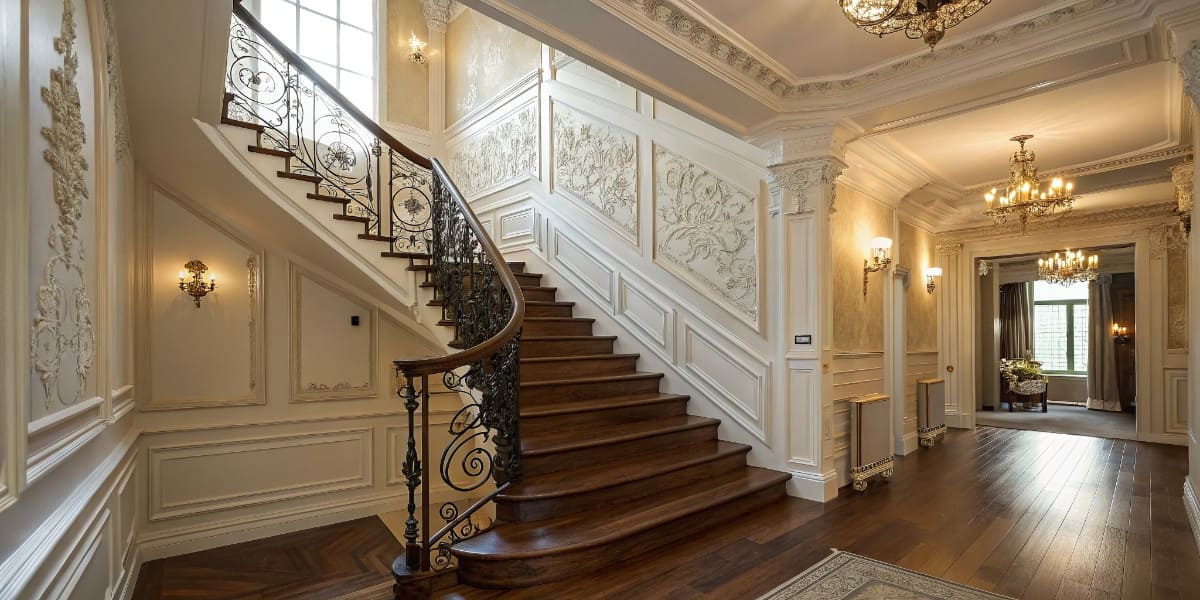 Классическая лестница — это симметрия, использование натурального дерева ценных пород, изысканный декор. Характерные черты: фигурные балясины, резные детали, массивные поручни. Это придает интерьеру торжественный, респектабельный вид.