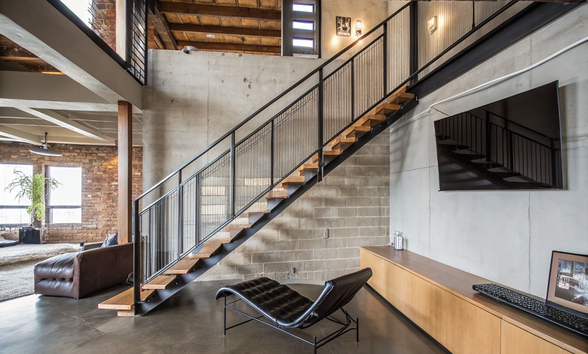 Лестницы в стиле лофт часто изготавливают из металла и необработанного дерева или бетона. Для них характерны открытые металлические каркасы, сварные швы, простые и грубоватые формы. Перила делают из металла, иногда с сеткой или тросами вместо балясин. Дизайн подчеркивает индустриальную эстетику пространства.
