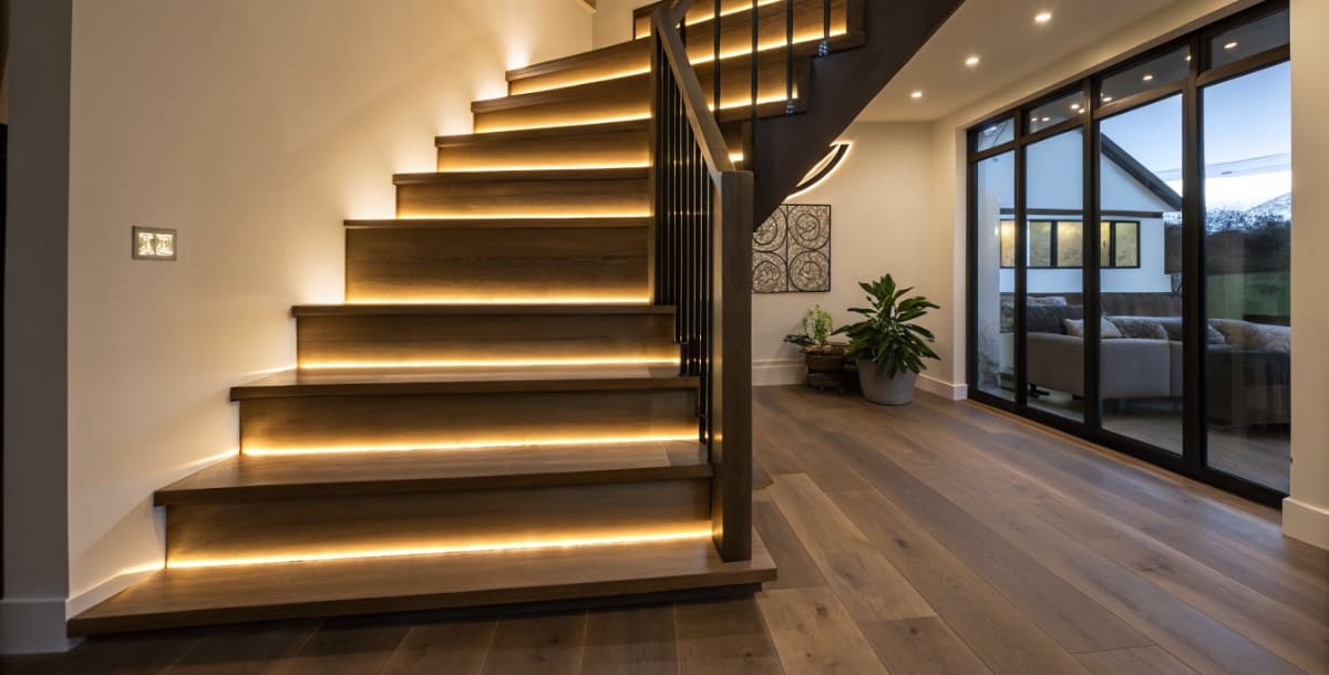 Освещение необходимо для безопасного использования лестницы в темное время суток. Свет может быть общим (люстра в пролете) или локальным. Встроенная в стену или ступени подсветка выделяет контур лестницы, создает в интерьере дополнительный акцент.