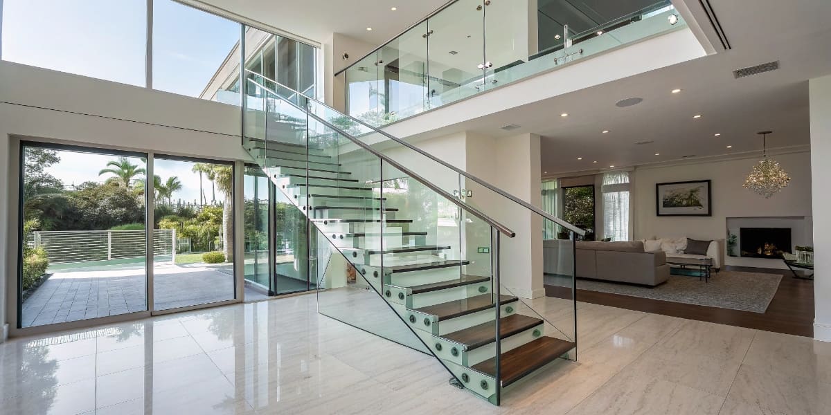 Стекло вносит в интерьер ощущение легкости, визуально расширяет пространство. Из него изготавливают ступени или перила. Используется специальное многослойное стекло (триплекс), которое выдерживает высокие нагрузки. Стеклянные элементы хорошо сочетаются с металлом и деревом, создавая современный эксклюзивный дизайн.