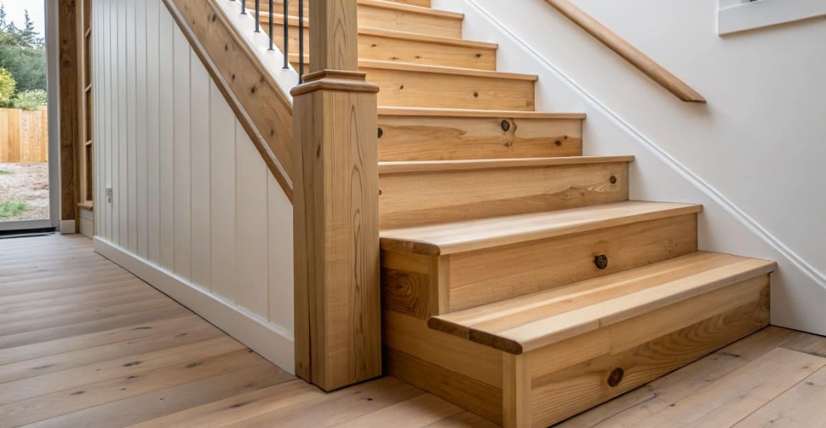 Дерево — классика для изготовления лестниц. Оно создает в доме атмосферу уюта, приятно на ощупь, позволяет реализовать проекты в любом стиле — от классики до скандинавского. Чаще всего используют массив дуба, ясеня, бука или лиственницы. Бюджетный вариант — сосна, которая требует дополнительной защитной отделки.