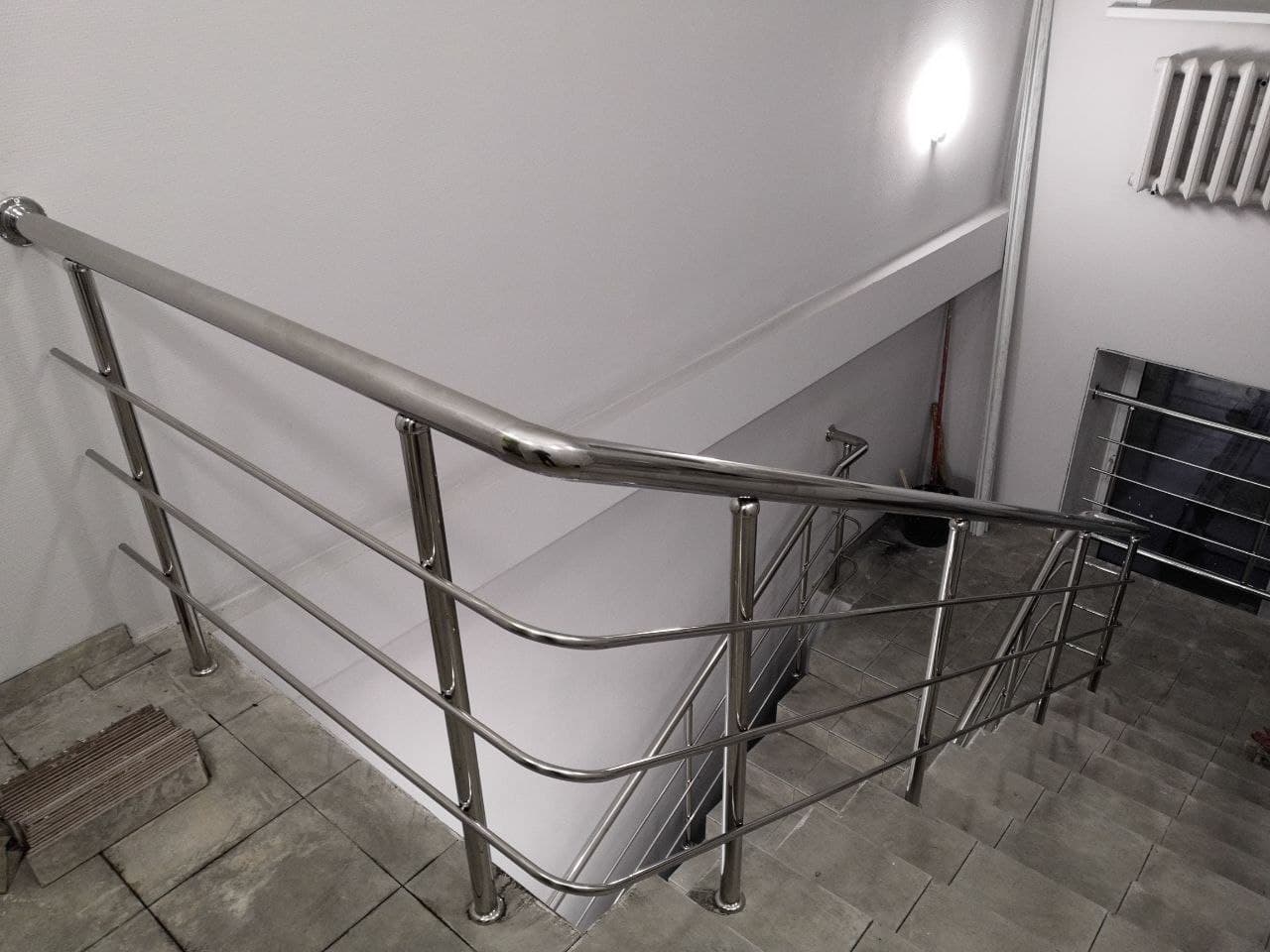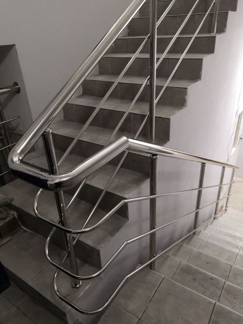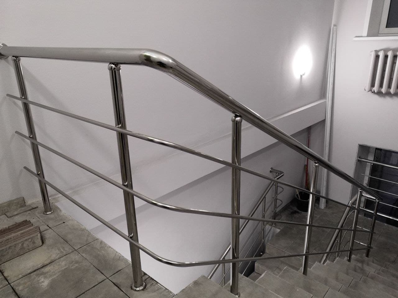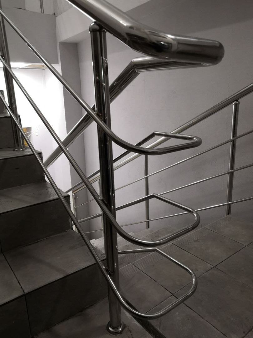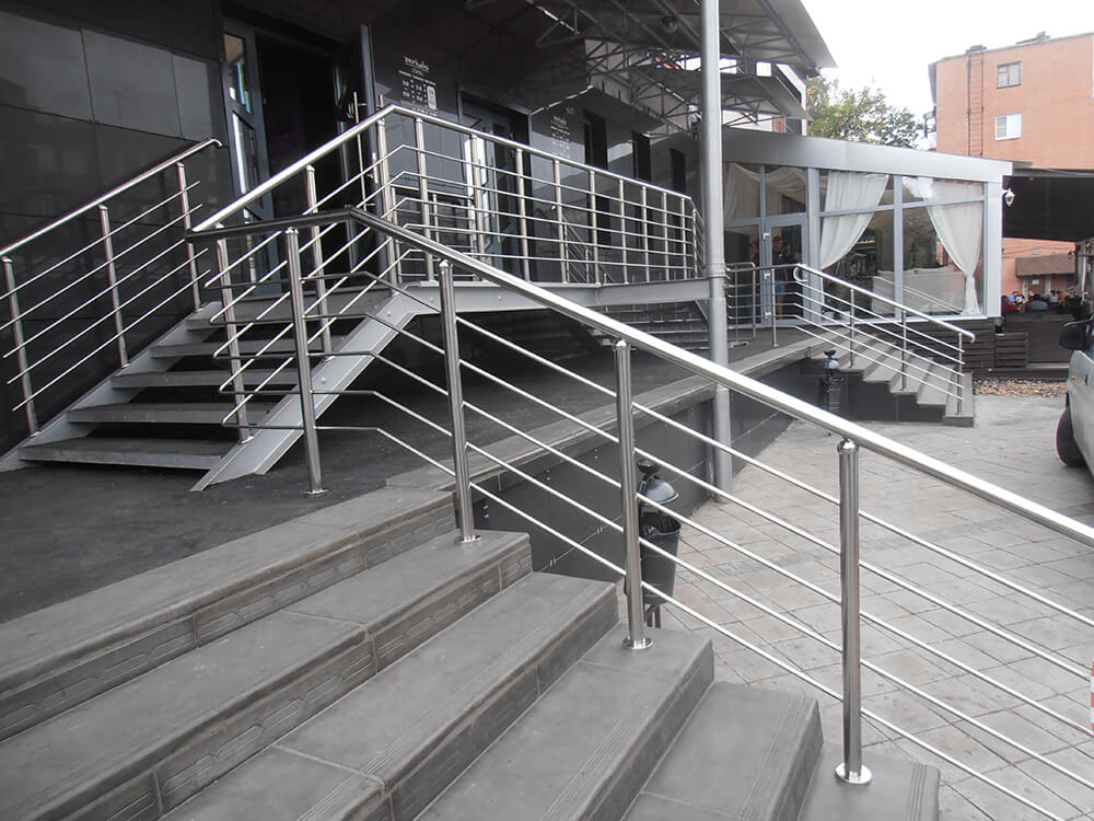 Изготовление и установка ограждений с двумя ригелями для магазина «Да!». Ограждение из нержавеющей стали марки AISI 304 с двумя ригелями – это оптимальный вариант для небольшого магазина. Высота поручня - 900 мм..., зеркальная поверхность. Стойки укреплены в межлестничные площадки и лестничные ступени при помощи химического состава. Это прочная и безопасная конструкция, которая прекрасно прослужит много лет.
