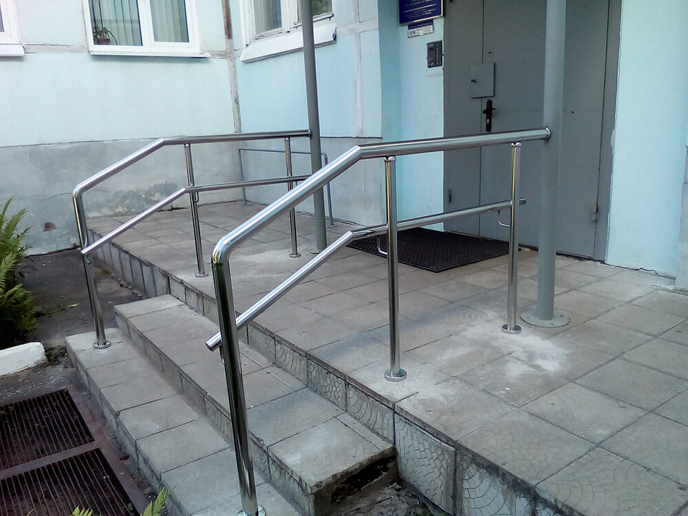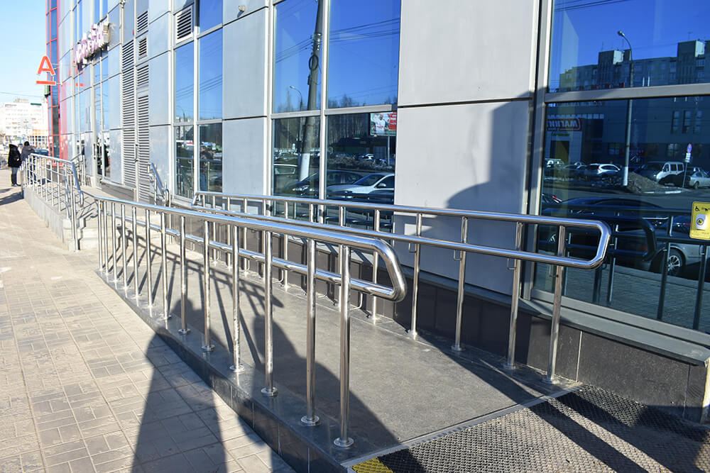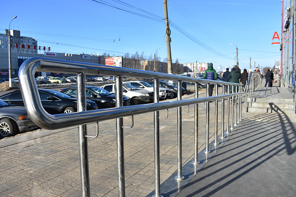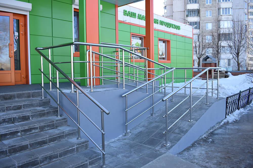 Изготовление пандуса и ограждения с двумя ригелями для магазина «Фасоль». Ограждение изготовлено из нержавеющей стали марки AISI304 Высота поручней – 900 мм, зеркальная поверхность. Это функциональное ограждение..., которое отличается высокой надежностью. Антикоррозийное покрытие позволяет обеспечить надежную защиту: ограждение не подвержено температурным и механическим воздействиям, не боится влажности, а, следовательно, рассчитано на длительную эксплуатацию.