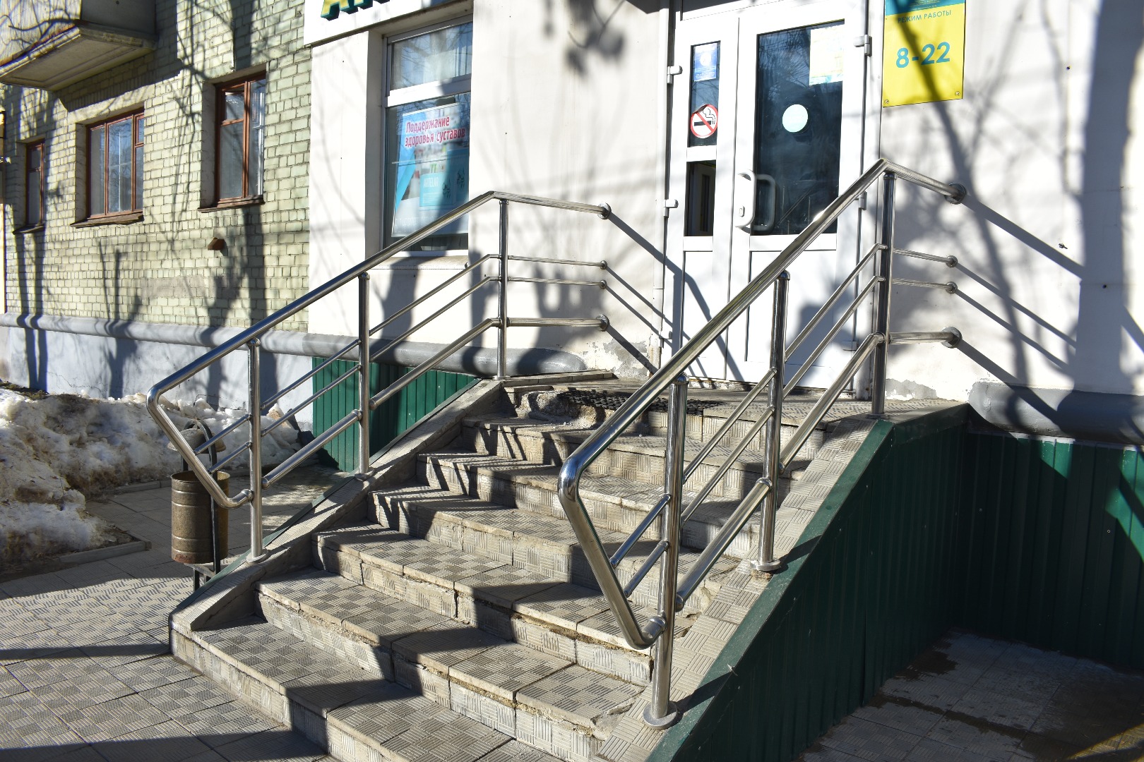Изготовление пандусов с двойным поручнем для офиса Сбербанка на ул. Можайского. Перила изготовлены согласно ГОСТу Р 51261-99. Высота поручней регламентирована по СНиП и составляет: верхний поручень - 0,9 м, нижн...ий - 0,7 м, уклон пандуса – 1,5 см. Поручни изготовлены из нержавеющей стали диаметром 50.8 мм. Благодаря своему наклону, пандус позволяет беспрепятственно попасть в здание людям с ограниченными возможностями.