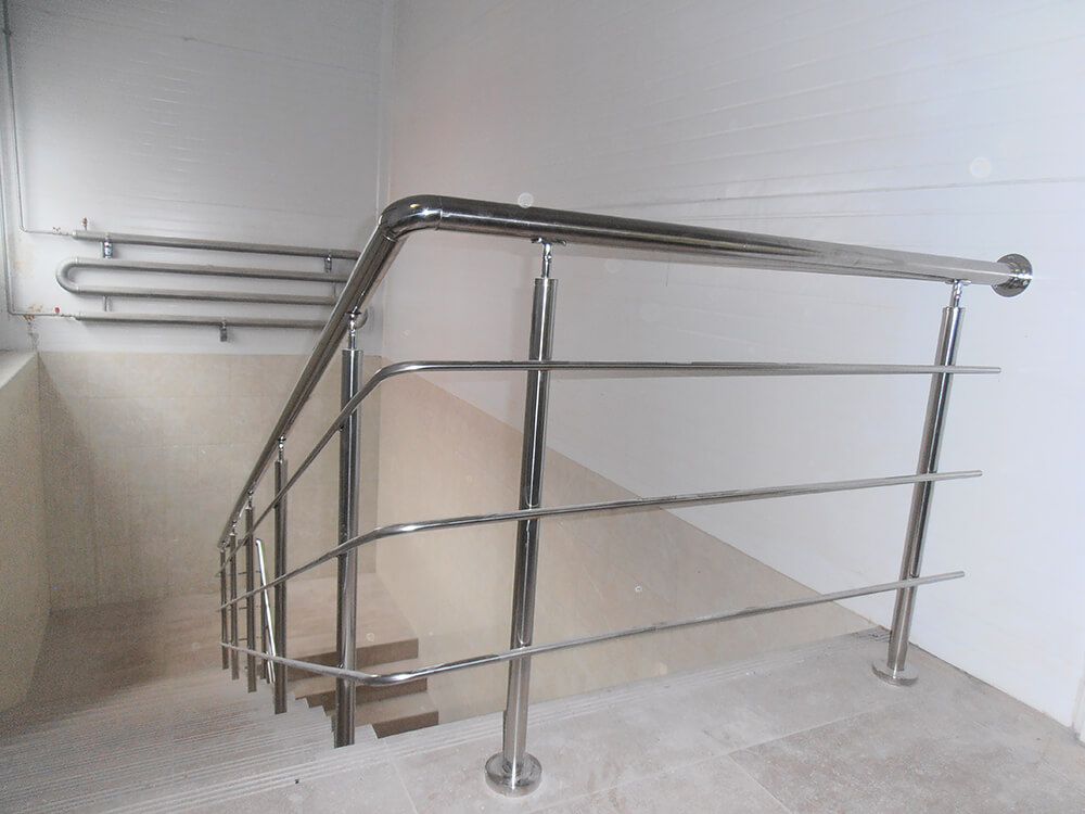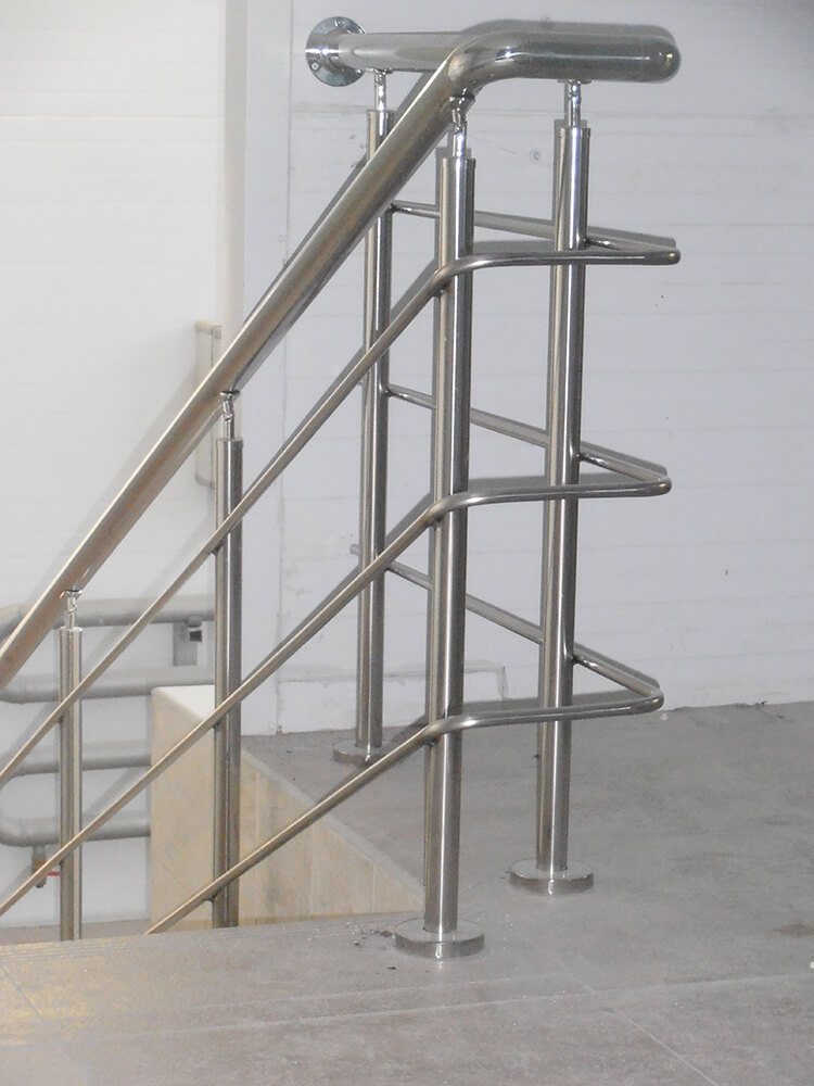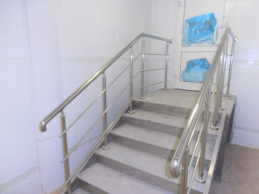 Изготовление и установка лестничных ограждений с заполнением из 3-х ригелей для Дмитрогорского мясокомбината. Это недорогое, но достаточно крепкое ограждение, с высотой поручня 900 мм и зеркальной поверхностью. ...Лестничные ограждения производятся с учётом ГОСТа 25772-83 и СНиПов 2.01.07-85, 31-06-2009. Лестничные ограждения изготовлены из нержавеющей стали марки AISI 201. Сталь этой марки обладает достаточной прочностью и не подвержена коррозии.